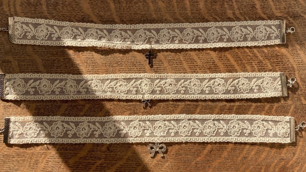 Collar de encaje con dije y cierre regulable de acero inoxidable. Viene con bolsa para guardar hecha a partir de retazos de encaje de lencería.